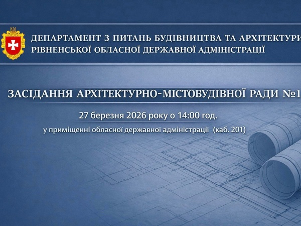 27 березня 2026 року о 14:00 год. у приміщенні обласної державної адміністрації (каб. 201) відбудеться засідання архітектурно-містобудівної ради при департаменті з питань будівництва та архітектури Рівненської обласної державної адміністрації.
